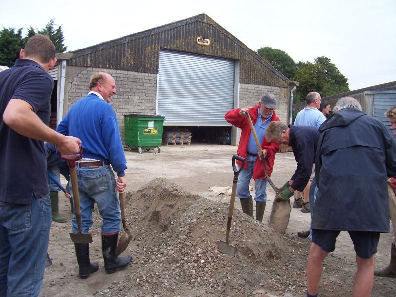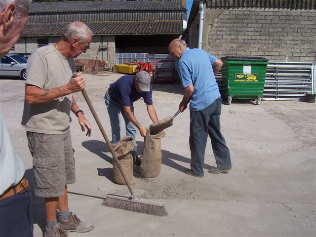 Saturday morning dawned bright and clear and the ‘early’ team all turned up on the farm at 10.15 as arranged. Here we were delighted to find that Sam from the farm had mechanically pre mixed a huge mountain of ballast and cement, so all we had to do was get it in to the bags. We quickly teamed up, one shovelling, another holding a bag and then moving it to one side when full. Jenny and Mick Stenning had it totally worked out – bringing along small stools to sit on – plus a spare! That’s teamwork for you!